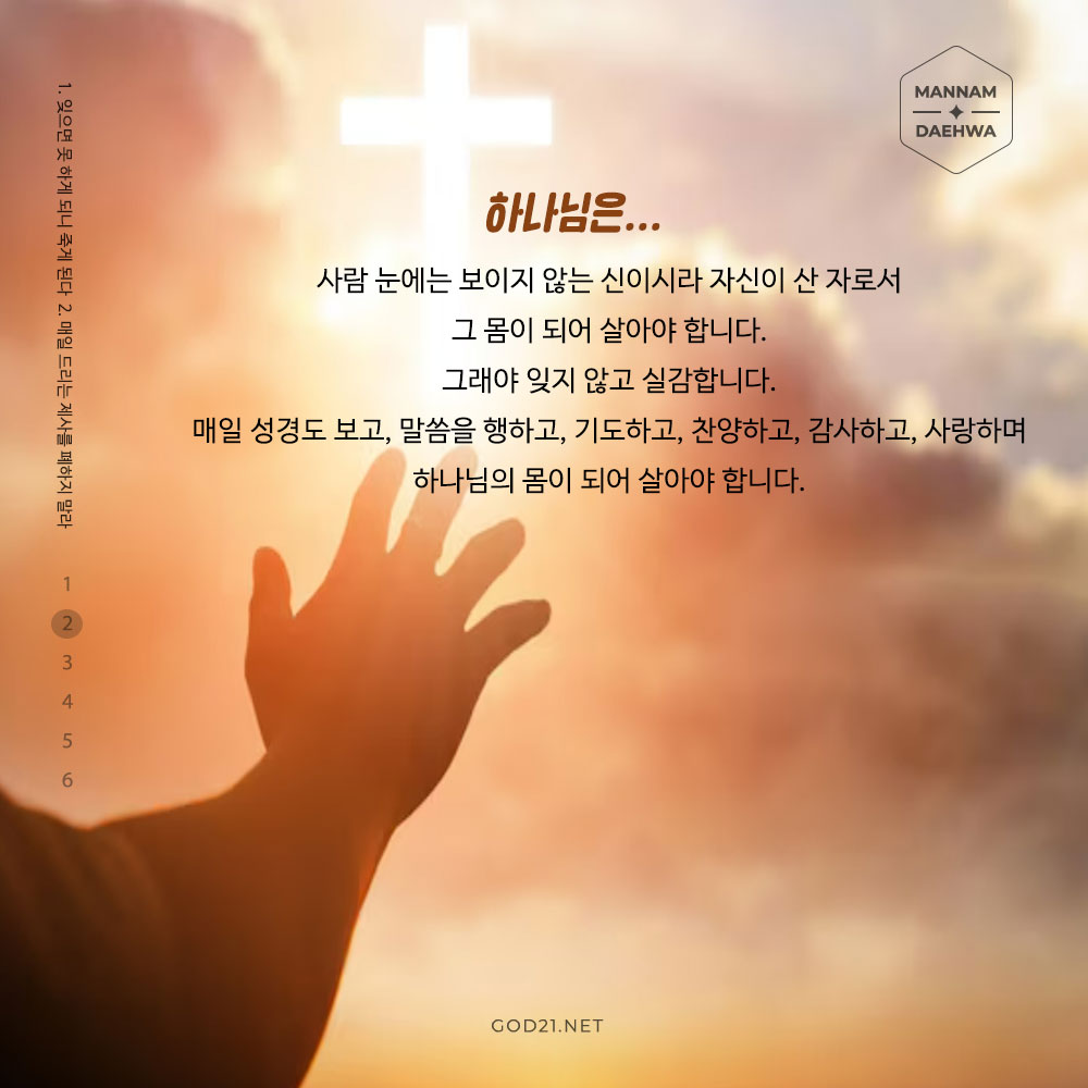 매일 성경도 보고, 말씀을 행하고, 기도하고, 찬양하고, 감사하고, 사랑하며 하나님의 몸이 되어 살아야 합니다.
