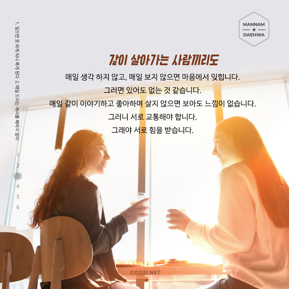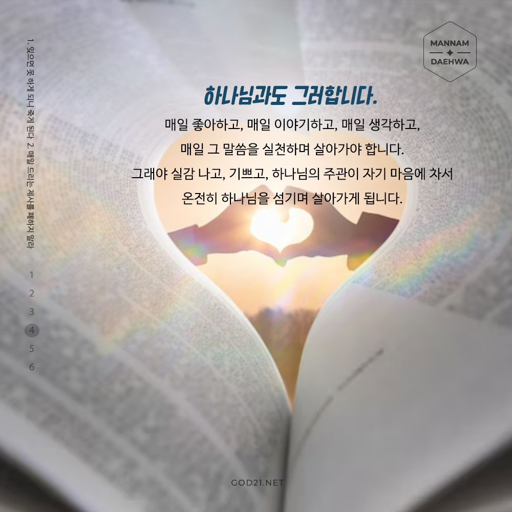 매일 좋아하고, 매일 이야기하고, 매일 생각하고, 매일 그 말씀을 실천하며 살아가야 합니다.