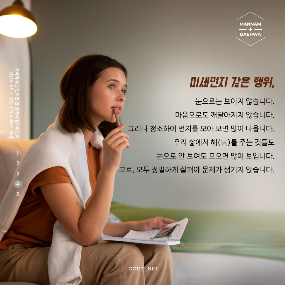 마음으로 죄짓고, 잡념, 잡생각 하면서 먼지 같은 죄를 지으니 즉시 회개해야 합니다.
